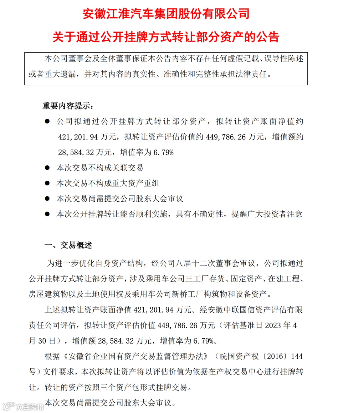 10月19日,江淮汽车发布公告称,公司拟通过公开挂牌方式转让部分资产,涉及乘用车公司三工厂存货、固定资产、在建工程、房屋建筑物以及土地使用权及乘用车公司新桥工厂构筑物和设备资产,拟挂牌价为44.98亿元。公告显示,本次交易拟分三个资产包进行,具体如下:一包:安徽江淮汽车集团股份有限公司乘用车公司三工厂存货、固定资产及在建工程。二包:安徽江淮汽车集团股份有限公司乘用车公司三工厂房屋建筑物、在建工程及土地使用权。三包:安徽江淮汽车集团股份有限公司乘用车公司新桥工厂构筑物和设备。据了解,此次涉及的江淮汽车资产转让的两家工厂,实际上就是江淮与蔚来合作的两座工厂,即江淮蔚来先进制造基地和蔚来第二先进制造基地,即蔚来F1工厂和蔚来F2工厂,这两家工厂都是由蔚来自建,但生产资质来自江淮汽车。业内认为,此次江淮汽车表面上是转让工厂,实际上是转让生产资质,该资产转让或最终由蔚来接手,从而实现独立生产资质。针对江淮汽车转让相关资产,蔚来联合创始人将总裁秦力洪回应表示,这两家工厂确实是江淮和蔚来合作的,但不会影响蔚来的生产经营。公司将在合适的时候针对相关事宜进行沟通,在此之前不会就此事发表评论。