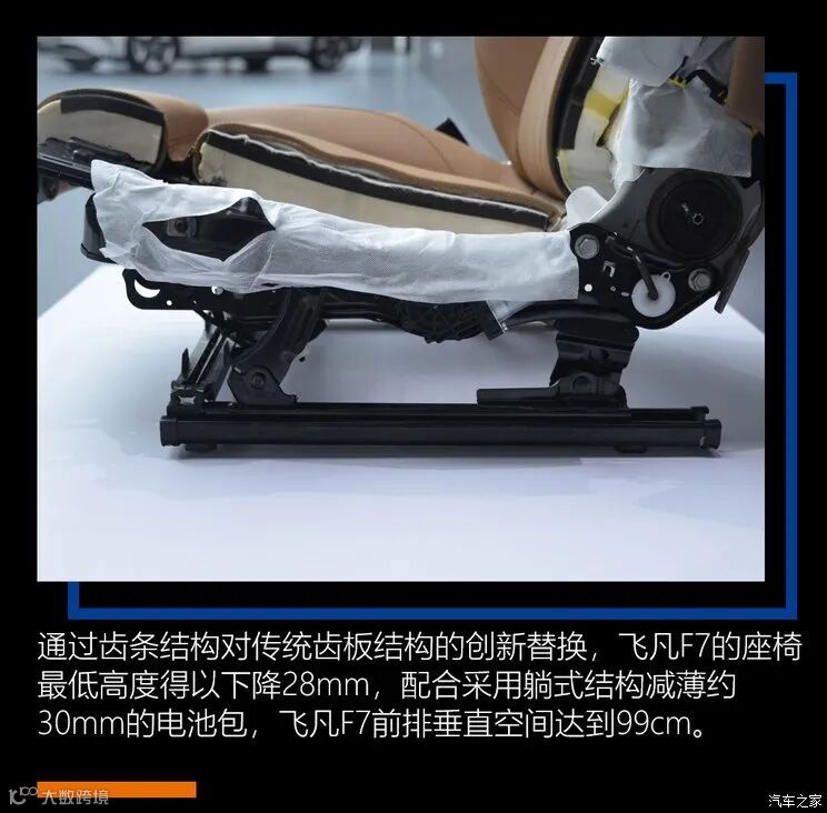 众所周知,电动车由于底盘下方布置的电池组原因,对车内垂直空间会产生一定影响,而这种影响在轿车上会更为明显,如果此时依然采用普通燃油车同款座椅的话,会进一步增加这种感受。而通过齿条结构对传统齿板结构的创新替换,飞凡F7座椅最低高度得以下降28mm,配合采用躺式结构减薄约30mm的电池包,飞凡F7前排垂直空间达到99cm。