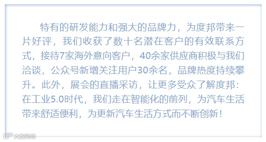 展会期间,各大厂商客户慕名而来,到我司展位进行亲切交流,其中不乏国内外著名汽车厂采购商,如大众、长安汽车、特斯拉等。通过互动沟通,客户对于度邦产品的性能与应用有了全面的了解,对我们产品应用之广、质量之可靠、制造之精密,表示极大赞赏,积极交换名片。