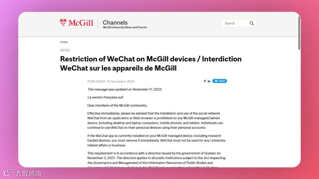 11月17日,麦吉尔大学信息技术服务部门在校园内网发布通知称,根据魁北克省政府的要求,学校禁止在任何学校管理的电子设备上继续使用微信。其中包括桌面电脑、笔记本、手机、平板等,而已安装微信的设备必须立即删除。通知还明确指出,任何与麦吉尔大学有关的事务都不能通过微信进行。