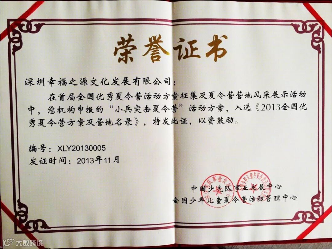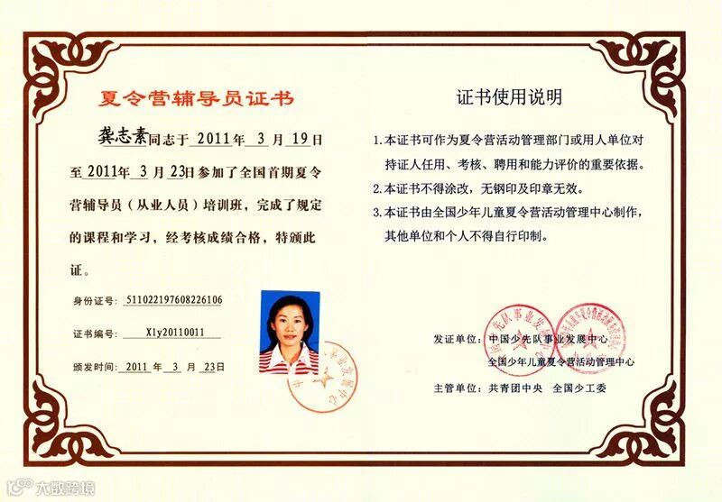 军歌嘹亮青少年部负责人龚志素老师获团中央首批夏令营辅导员证书