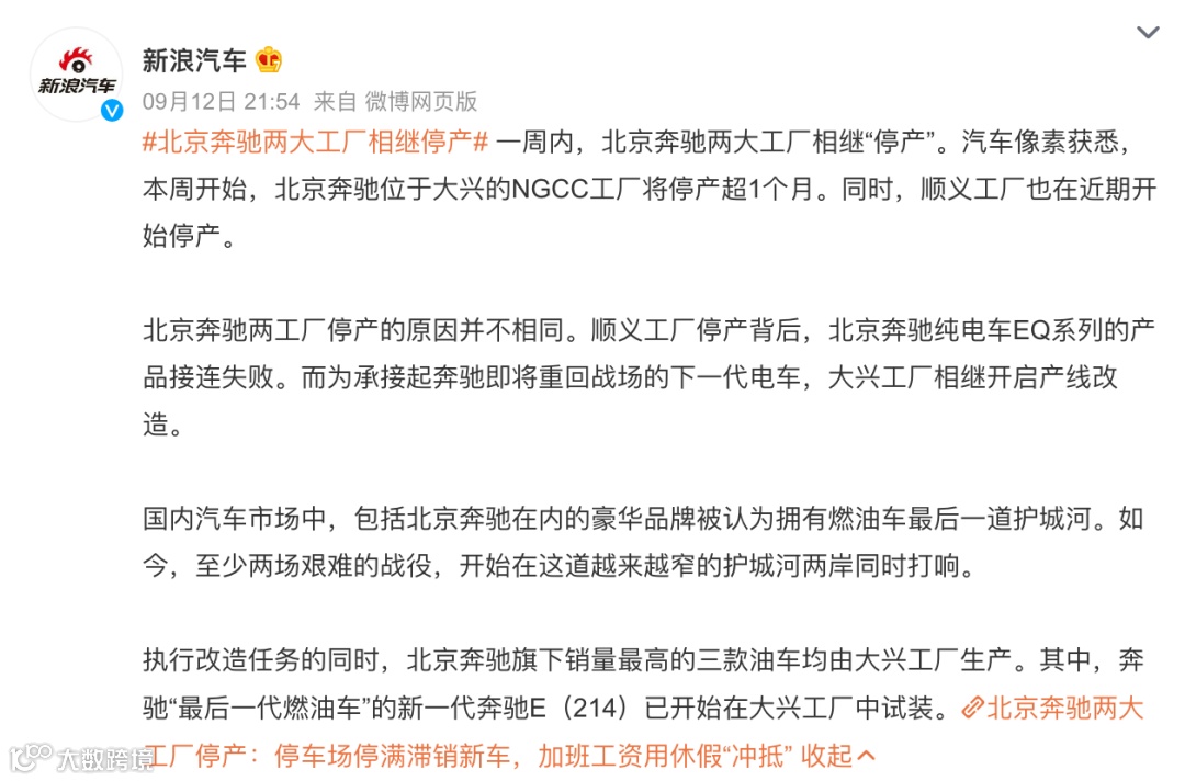 据《汽车像素》报道,一周内,北京奔驰两大工厂陆续停产。报道称,北京奔驰位于大兴的NGCC工厂将停产超40天,同时顺义工厂也于近期开始停产。据了解,北京奔驰在国内布局有两大整车制造工厂——大兴工厂和顺义工厂,其中大兴工厂也被称为前驱车工厂,主要生产包括GLA级、A级、GLB级、E级长轴距版、C级长轴距版等,而顺义工厂能够实现混线生产奔驰FMA前驱平台、MRA后驱平台、EVA2电动平台电动车,投产GLB级、EQA、EQB、EQC、EQE等车型。至于停产的原因,大兴工厂主要因为产品转型,该工厂将承担下一代CLA的生产,需完成现有MFA平台向MMA平台的改造。在2023慕尼黑车展开幕前夕,梅赛德斯-奔驰正式发布全新CLA级概念车,其量产版车型将会在2024年推出,将会成为MMA架构打造的首款车型。