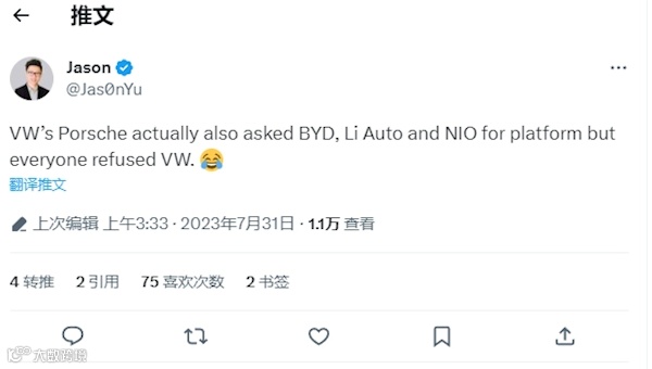 据GAMINGDEPUTY报道,根据汽车分析师@Jas0nYu(Jason)在推特发布的信息,大众汽车集团旗下豪华品牌保时捷曾寻求与比亚迪、理想和蔚来进行平台合作,但最终保时捷的请求被这几家车企拒绝了。保时捷上周表示,该公司面临着加快电动化转型的压力,由于面临软件推迟的难题,保时捷不得不推迟发布几款主要的纯电动车型(其中包括纯电动版Macan)。与此同时,由于零部件短缺,保时捷唯一的纯电动车型Taycan上半年的交付量同比下降5%。保时捷首席执行官Oliver Blume此前曾表示,未来几年,保时捷将在电动化和数字化领域投资超过200亿欧元,并计划到2030年力争使纯电动车型占其新车销量的80%。