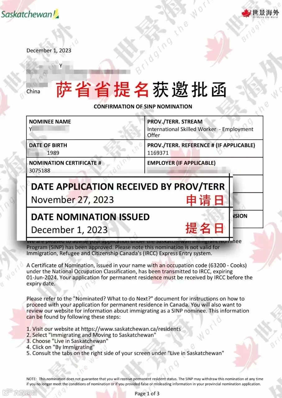 恭喜世景海外的萨省雇主担保客户获批省提名!