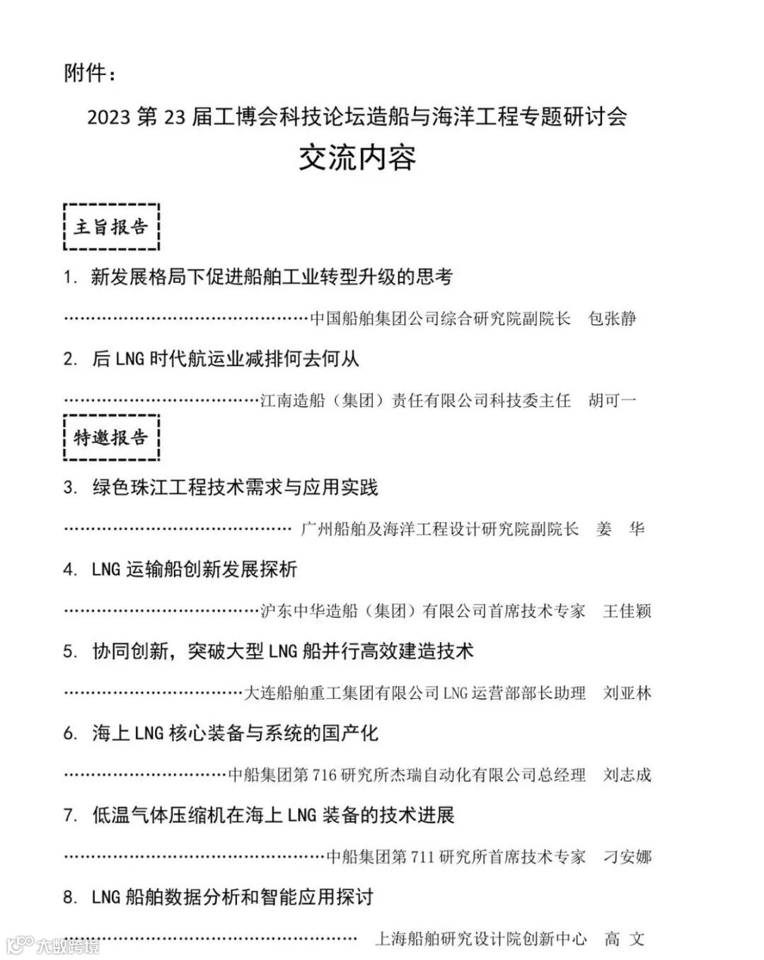 举办“2023第23届中国国际工业博览会科技论坛造船与海洋工程专题研讨会”。会议将邀请上海及长三角、珠三角和渤海湾等地区各大船企、研究设计院所、大学、船级社及各配套设备公司等科技人员参加会议。