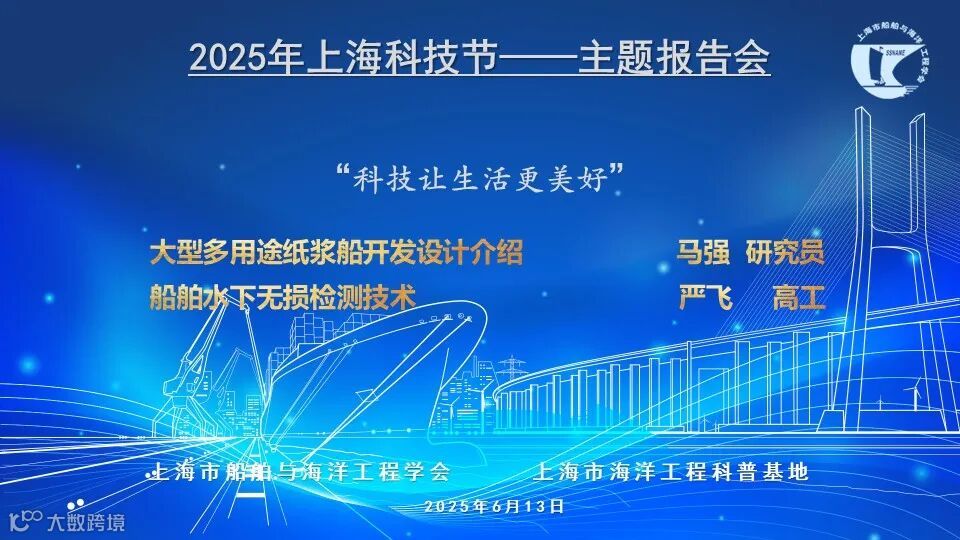 根据《科技部 中央宣传部 中国科协关于举办2025年全国科技活动周和全国科技工作者日活动的通知》有关精神以及上海市科学技术委员会印发的沪科〔2025〕141号文件,6月13日,上海市船舶与海洋工程学会和上海市海洋工程科普教育基地在上海市科学会堂思南楼联合举办主题为“科技让生活更美好”的上海科技节主题报告会。本次报告会邀请到上海船舶研究设计院马强研究员和中国船舶第726研究所瑞洋公司严飞高工,分别就“大型多用途纸浆船开发设计介绍”和“船舶水下无损检测技术”做精彩报告。学会科普和学生工作委员会执行副主任韩华主持主题报告会。