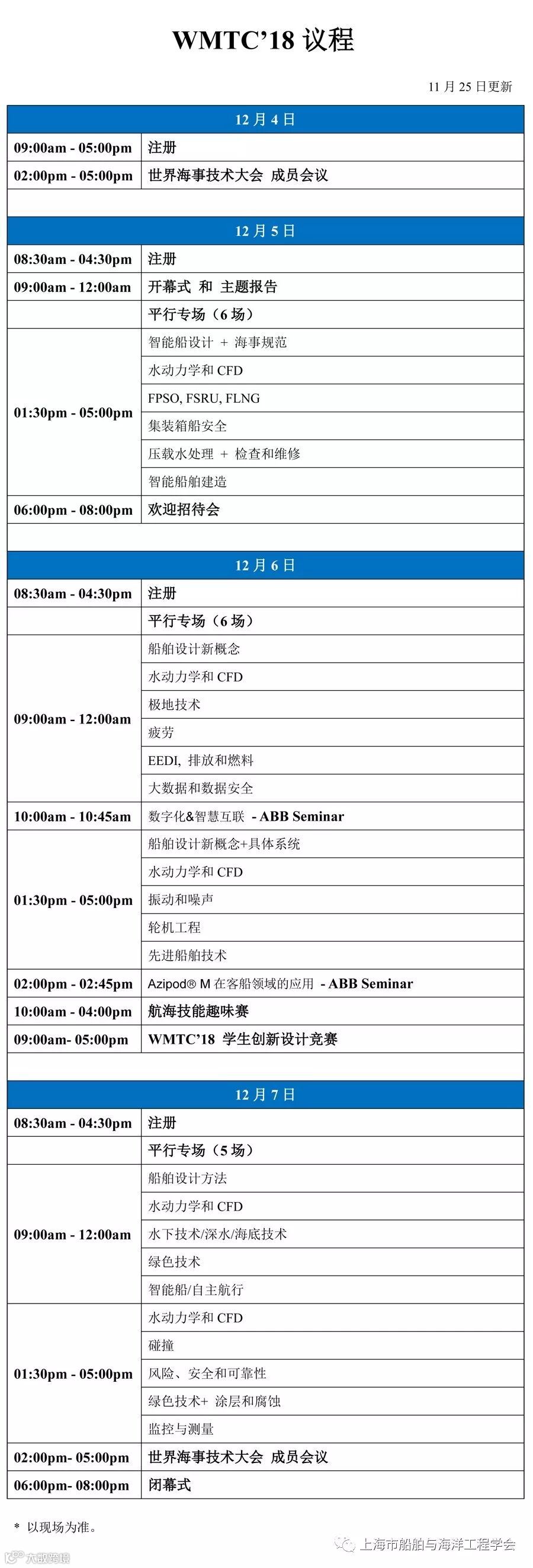 一周后的2018年12月5日,目前国际海事领域最具规模和影响力的专业学术会议——2018世界海事技术学术会议将在上海开幕。除主题报告外,本届大会共设27个学术专场,现场交流论文近180篇。截至上周末,已报名参会代表超过1000人次,来自世界14个国家的专家和学者将出席为期三天的会议。