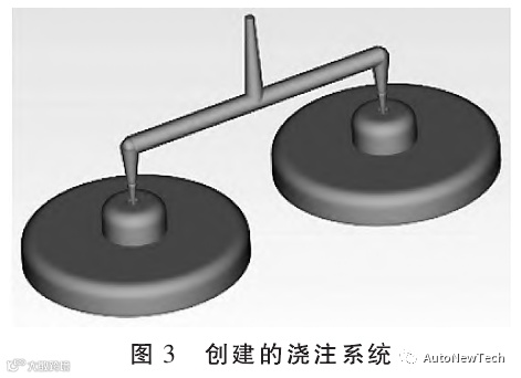 在本文中,塑件采用一模两腔注塑,结构对称布置,分流道对称且等距,塑件熔体到两型腔距离一致。初步创建的浇注系统如图 3 所示。