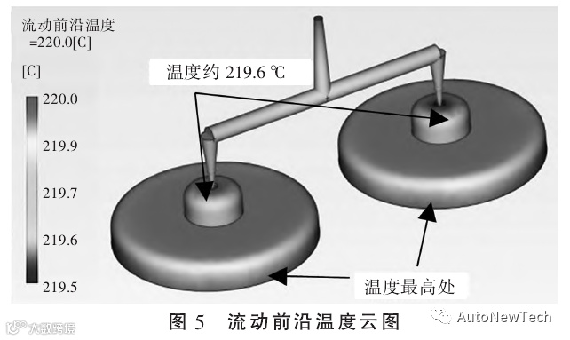 图 5 是充模结束时的流动前沿温度云图。通常情况下,应将填充阶段中流动前沿的温度变化降到最低,理论上温度差极限 5 ℃[6],温度变化越小,产生的问题就越少。而由图 5 可知,本浇注系统的流动前沿温度在219.5~220 ℃,熔体的温差约为 0.5 ℃,数值较小,意味着注塑成型过程中温度分布较均匀,塑件尺寸精度较高,并且最高温度与最低温度均在推荐的熔体温度范围之内,说明熔体在流动的合理范围内,具有较高的流动性。