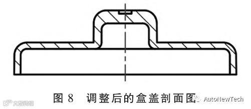 基于在推荐的成型工艺参数下,仿真模拟结果不理想,结合盒盖的应用状况,对盒盖进行了结构优化(图 8),调整后中间凸台位置壁厚减小,与其他位置壁厚基本一致,减少了熔料的注入。有限元分析(如图9所示,图中URES表示合位移)结果表明,在 20 N 的受力状态下,最大静态位移量从初始结构的0.003186 mm 增加到0.005066 mm,虽增幅较大,但绝对数依然极小,对应用无影响。