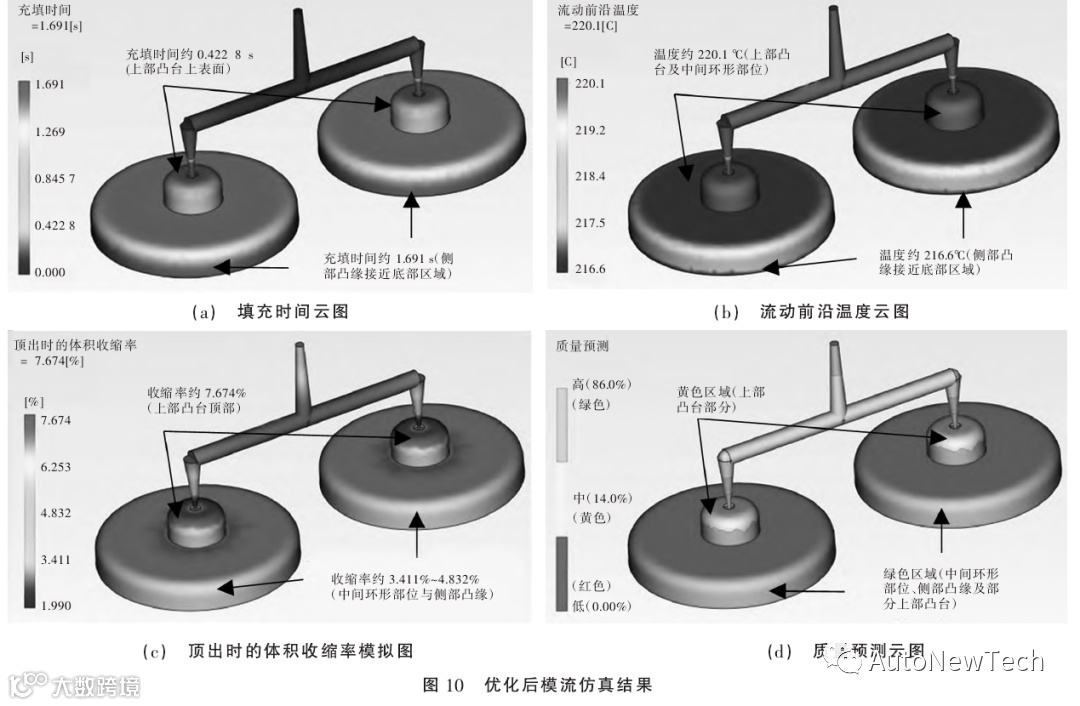 顶出时的体积收缩率(图 10(c))最大为 7.674%,按照体积收缩率低于 8%为较佳的标准[8],结构优化后的顶出时的体积收缩率达到了要求。质量预测(图 10(d))则显示绿色高质量区域为86%,黄色区域占比 14%,但是如果去除流道部分,绿色区域占比将增大,而黄色区域占比将减小。后期可通过优化成型工艺参数提高塑件质量。