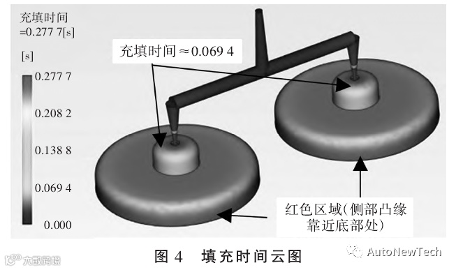 图 4 为填充时间云图。图中,左侧图例栏中,底部代表填充开始,顶部代表熔体最后到达的位置。填充时间为 0.277 7 s。填充时浇口位于塑件上部凸台顶部,从顶部向下方再沿径向充型,初始位置最厚,流动充型阻力较小,流动顺畅,熔体的充型速度较快,用时较短。同时可观察到,两塑件末端颜色相同(红色区域,侧部凸缘靠近底部处),且颜色过渡较为均匀,说明两型腔同时完成了填充,填充过程是平衡填充。