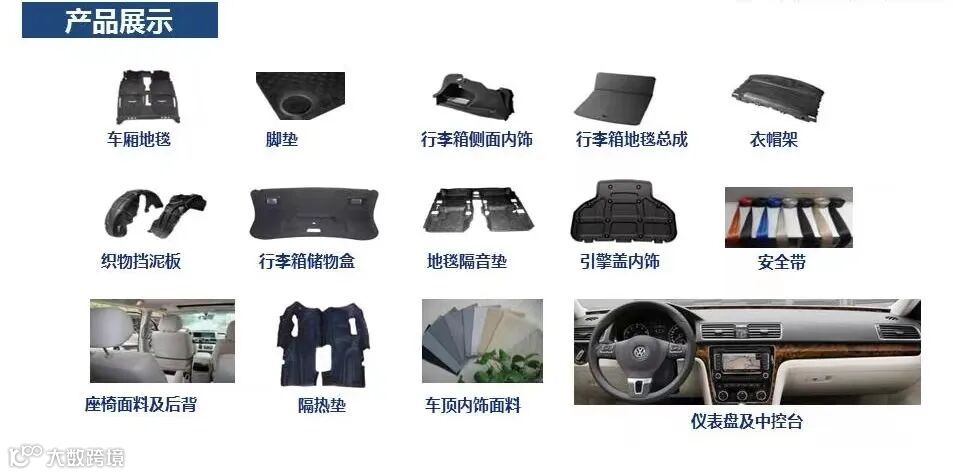 我们主要配套生产车顶内饰、座椅面料、车厢踏垫、地毯总成、外饰轮罩、衣帽架总成、行李箱顶饰、行李箱地毯、行李箱盖内饰、行李箱前饰等汽车内饰产品以及包括隔音垫、隔热垫、隔音前围、轮拱内衬等汽车声学元件产品。