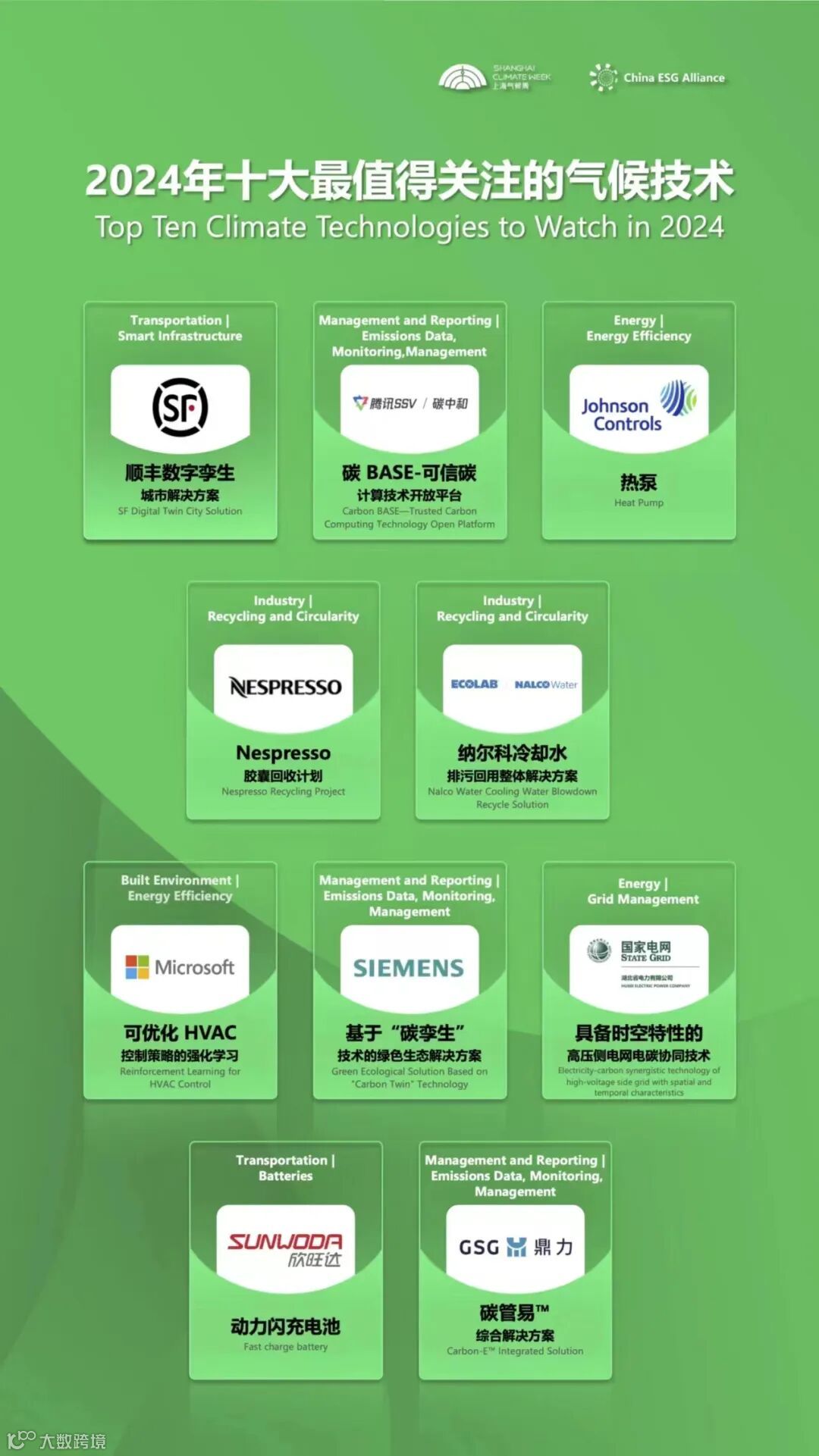 在上海气候周“全球合作伙伴”China ESG Alliance与Sustainable Solutions Alliance低碳办公联盟联合举办的《重塑气候技术,焕发城市未来》主题论坛上,China ESG Alliance联合上海气候周,共同发布“2024年十大最值得关注的气候技术”。