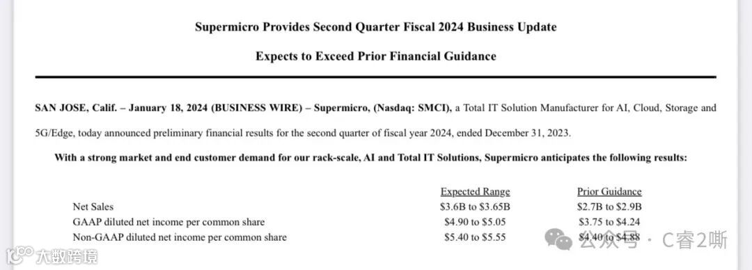 SMCI上调FY24 2Q业绩预期,营收上调接近30%,EPS 上调接近20%,毛估估CY24全年EPS run rate ~$25+。再次印证了上次学到的,潮水来了,立即裸泳,当然这靠的应该也不是无脑信仰梭哈,而是相信基本的商业规律