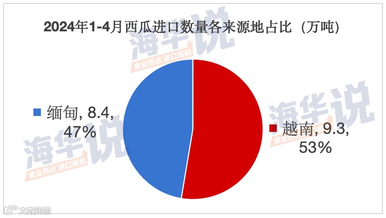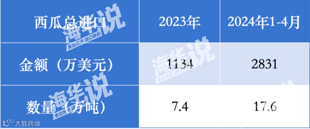 据可靠数据,今年1-4月份,西瓜的进口量已经达到惊人的17.6万吨!这个数字已经超过去年全年的7.4万吨,整整翻了一番!