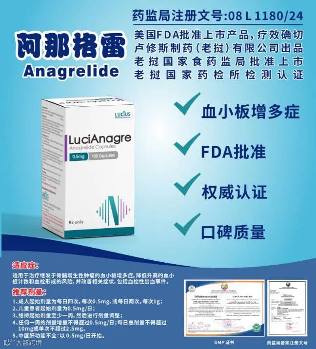 阿那格雷是一种血小板减少剂,用于治疗继发于骨髓增生性肿瘤的血小板增多症,以降低血小板计数升高和血栓形成的风险,并改善相关症状,包括血栓出血事件。