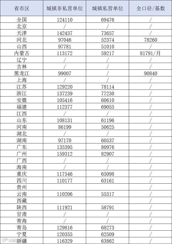 公积金基数调整依据各国省市就业人员平均工资,现各省份公布了城镇单位就业人员平均工资与最低工资,数据如下: