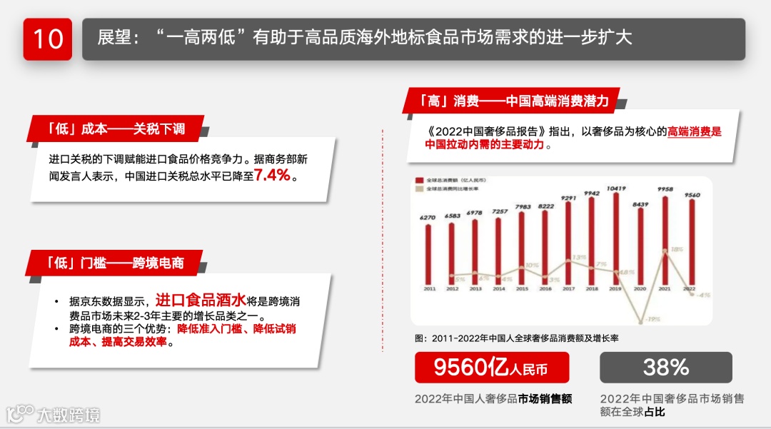 而“两低”是指中国市场的两大政策利好。一是“低成本”,中国进口关税的下调增加了进口食品的价格竞争力。据商务部新闻发言人表示,中国目前的进口关税总水平已降至7.4%。二是“低门槛”的跨境电商模式。这种模式具有三个优势:降低准入门槛、降低试销成本以及提高交易效率。