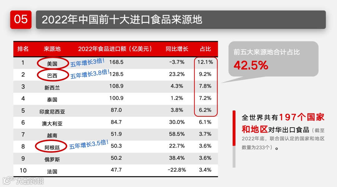 马海华对中国进口食品的数据进行了深入分析。他指出,中国进口食品总金额已经连续五年增长,累计增长高达89.7%。到2022年为止,全球共有197个国家和地区向中国出口食品。其中,前五大来源地的进口金额合计占比高达42.5%,而美国(进口额为168.5亿美元,排名第一,五年内增长了3倍)和巴西(进口额为128.5亿美元,排名第二,五年内增长了3.8倍)是五年间增长最快的两个国家。