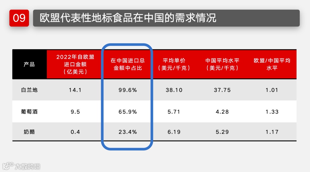 马海华还提到,中国市场的“一高两低”现象对于高品质海外地标食品的市场需求扩大起到了积极作用。“一高”是指中国的高端消费潜力。根据《2022中国奢侈品报告》的数据,以奢侈品为核心的高端消费是中国拉动内需的主要动力。就进口数据而言,2022年自欧盟进口的白兰地、葡萄酒等高品质、高单价的欧盟代表性地标产品,在中国总进口金额中占比分别高达99.6%、65.9%。