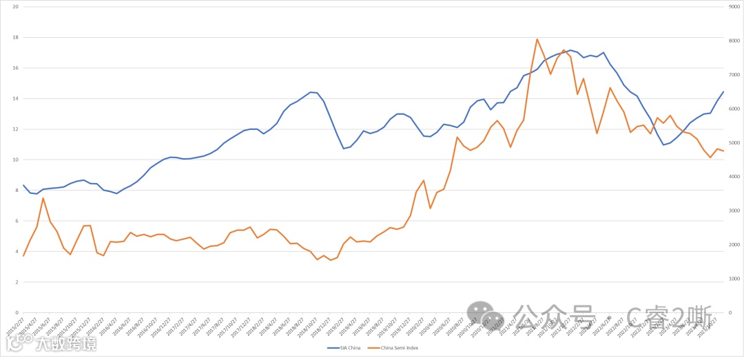 注:图太小,蓝线是中国半导体销售额,橙线是是大A半导体指数