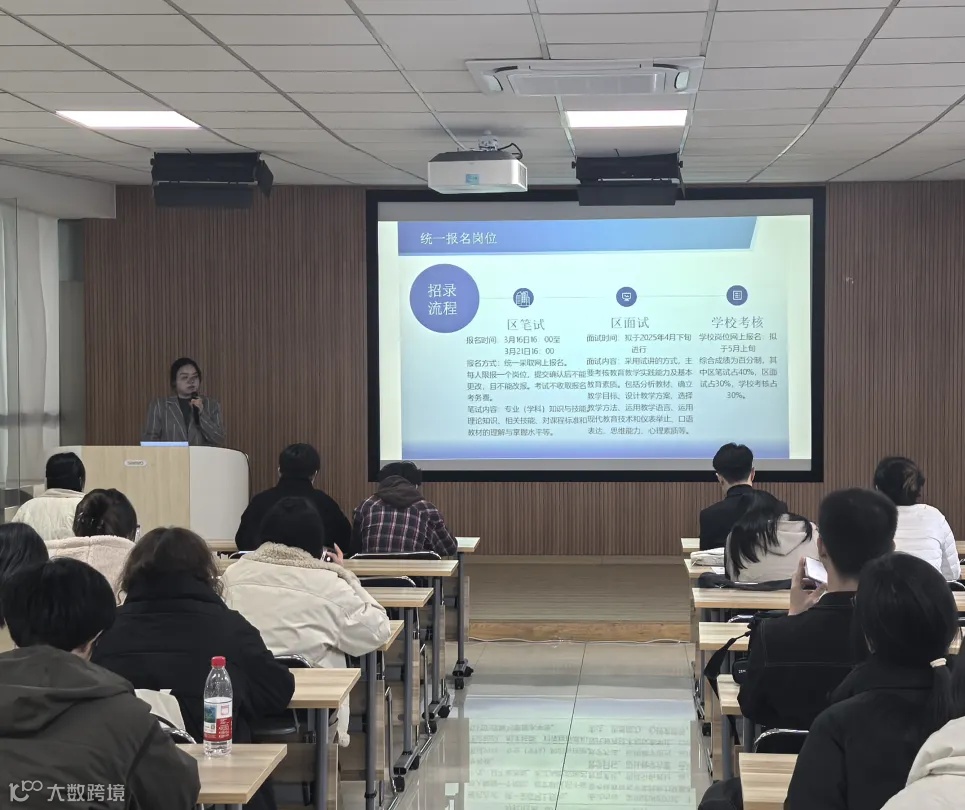 临港新片区社发处教育干事吴濛以“以教育兴城,建教育新城”为主题,作临港新片区教育发展情况宣介、教育人才政策解读以及招录流程讲解。
