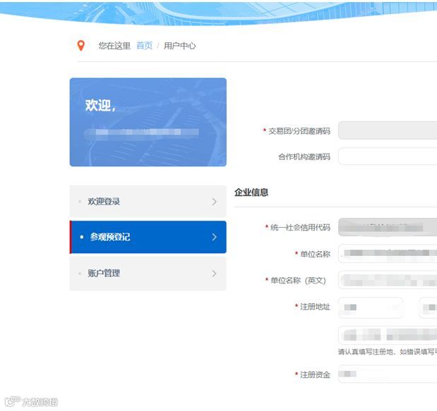随后在账户页面内依次填写“采购意向” 、 “参观人员信息”。