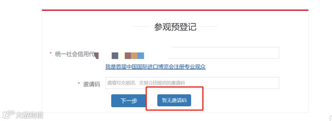 进入“新用户注册”页面后,输入单位的“统一社会信用代码”,点击“暂无邀请码” 后,进入“下一步” (如有交易团邀请码请在此处填写,食土商会邀请码不在此处填写)。