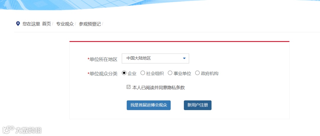 选择“所在地区”和“单位观众分类”后,点击“我是首届进博会观众” 进入下一个页面。