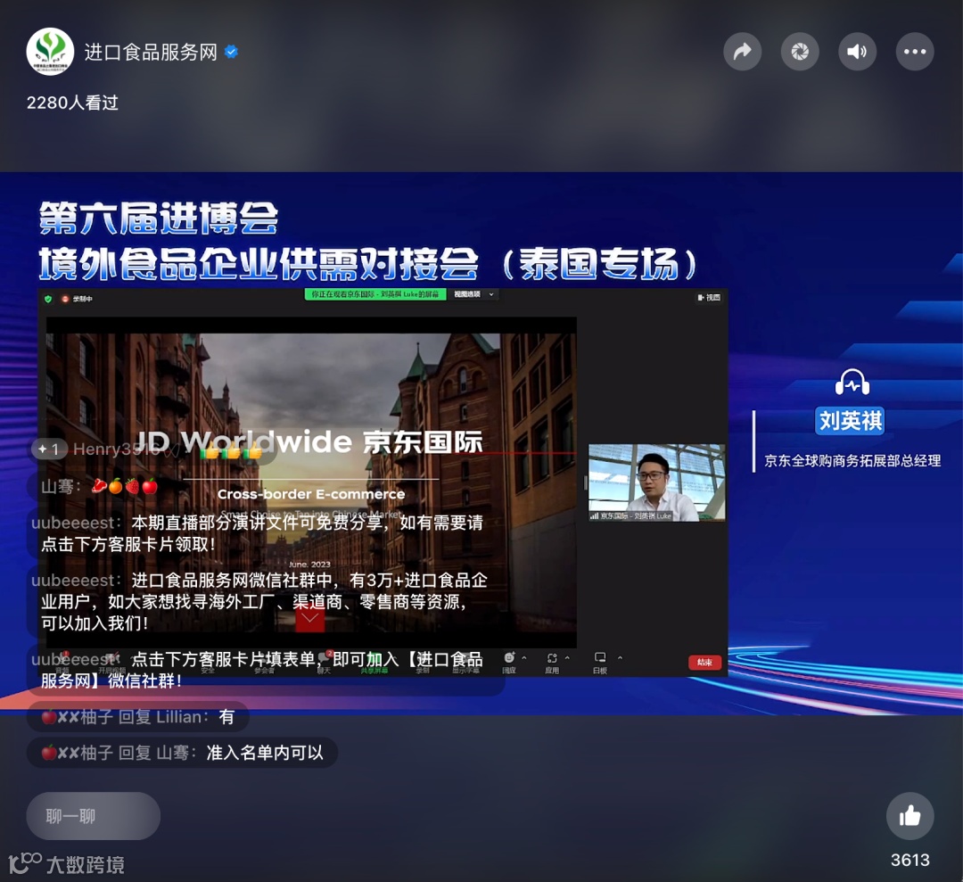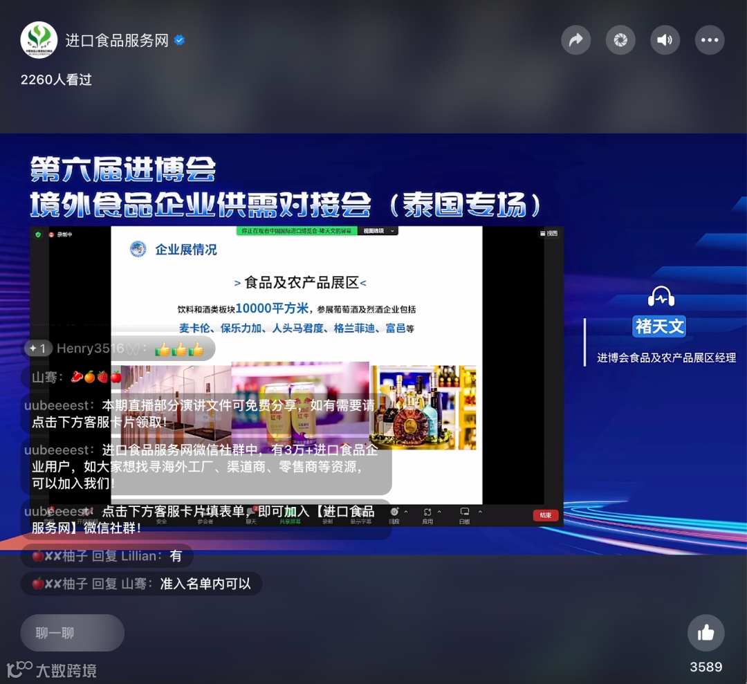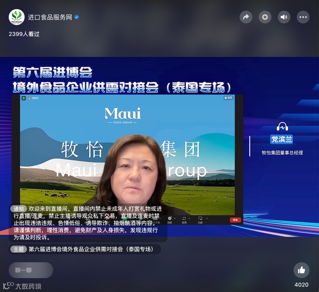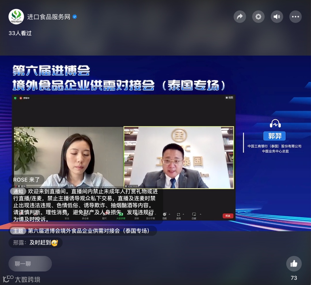 6月6日,由工商银行泰国分行与进口食品服务网共同主办的《第六届进博会境外食品企业供需线上对接会(泰国专场)》成功举办,本次活动得到了进博会食品及农产品展区、工商银行上海市分行的大力支持。20多家泰国企业参会,近2500位中国采购商于线上观会、互动。