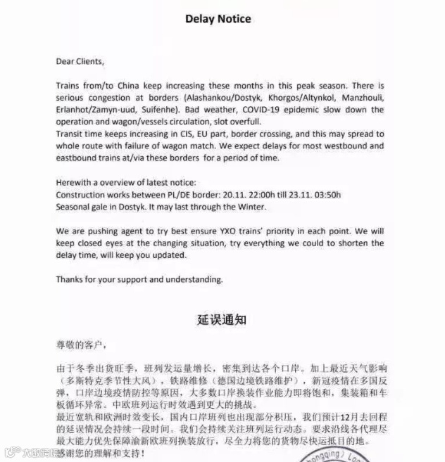 该公司发出的公告指出,由于冬季是出货旺季,班列发运量增长,密集到达各个口岸。加上最近天气影响(多斯特克季节性大风),铁路维修(德国边境铁路维修),新冠疫情在多国反弹,口岸边境疫情防控等原因,大多数口岸换装作业能力即将饱和,集装箱和车板循环异常。预计12月去回程的延误情况会持续一段时间。