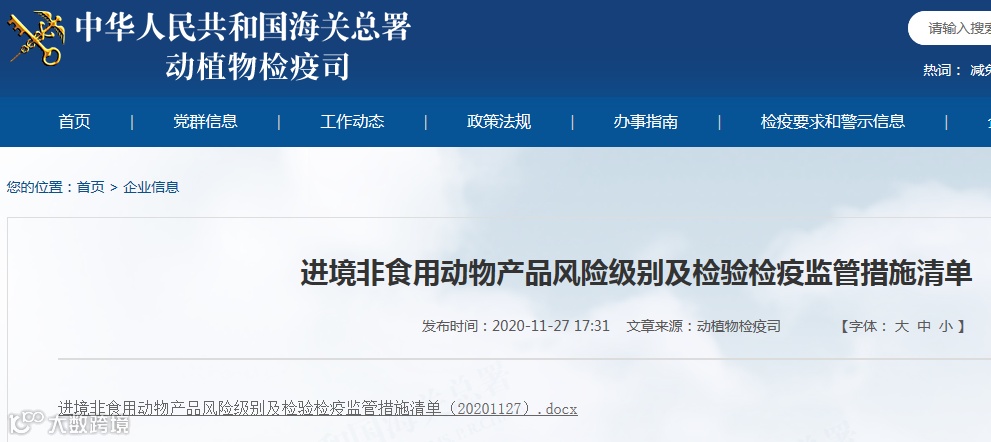 11月27日,海关总署更新进境非食用动物产品风险级别及检验检疫监管措施清单,涉及皮张、油脂、水产品等。