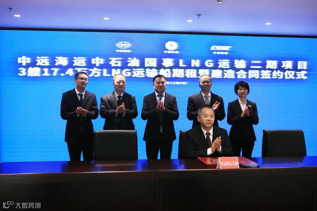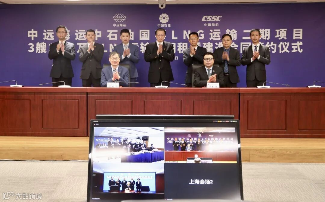 12月7日,备受业界瞩目的中远海运中石油国事LNG运输二期项目签约仪式,在北京、上海和大连通过“云签约”视频连线成功举行。中国船舶沪东中华LNG总建造师何江华和中船贸易副总经理吴爱军作为卖方代表,中石油国际事业有限公司副总经理罗亦周、上海中远海运液化天然气投资有限公司(上海中远海运LNG)总经理丛剑和中远海运石油副总经理纪明斯作为买方代表共同签署3艘17.4万方大型LNG运输二期项目的建造合同,项目租船合同也在仪式上一并签署。