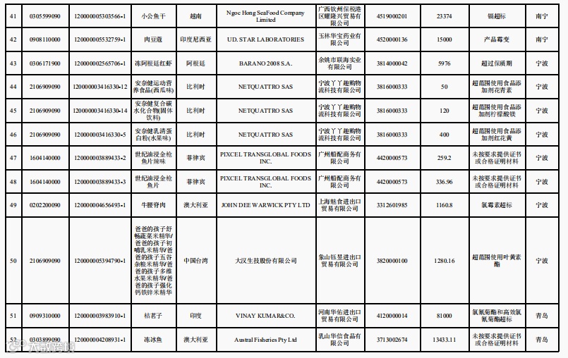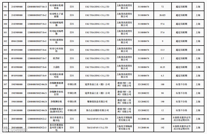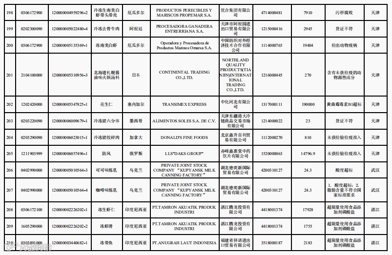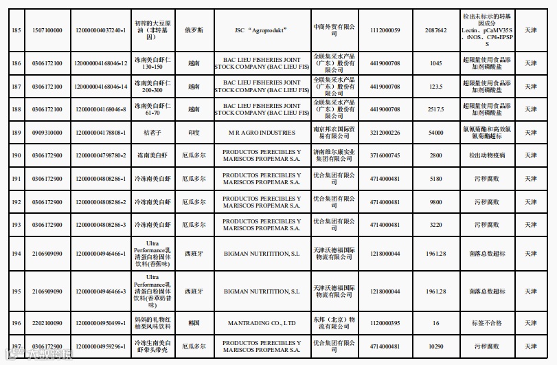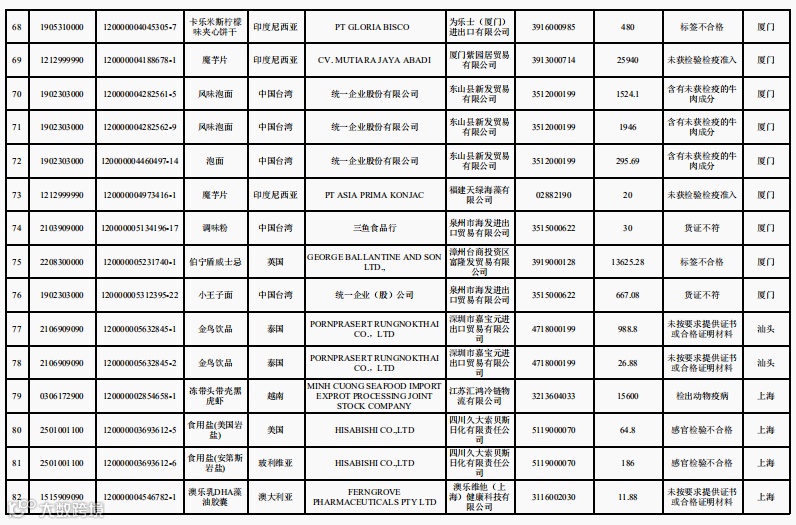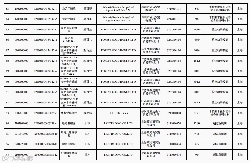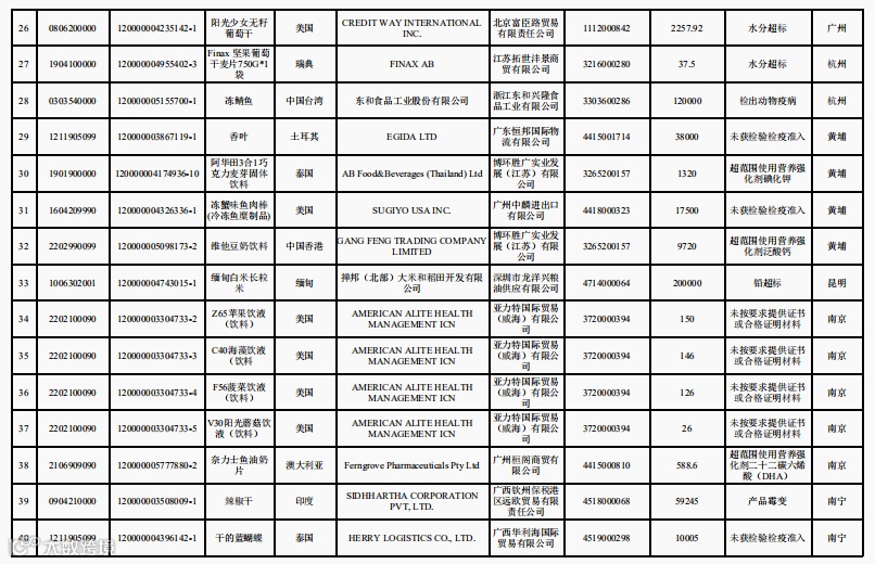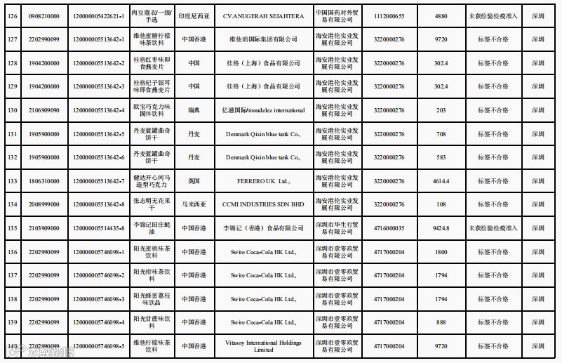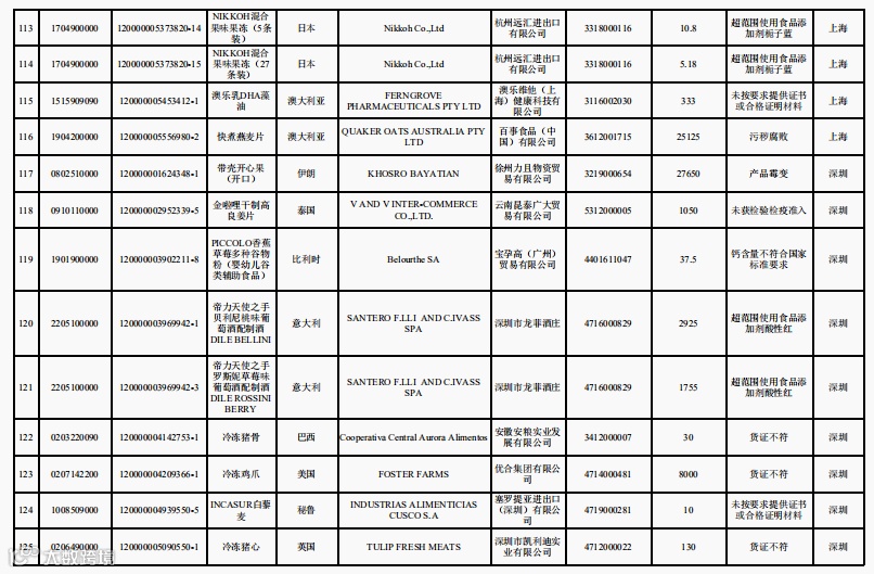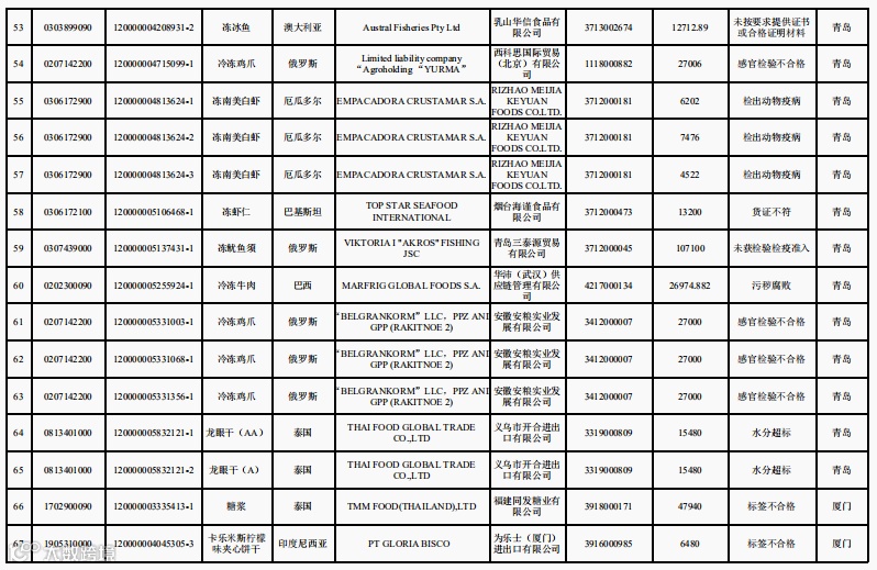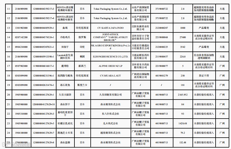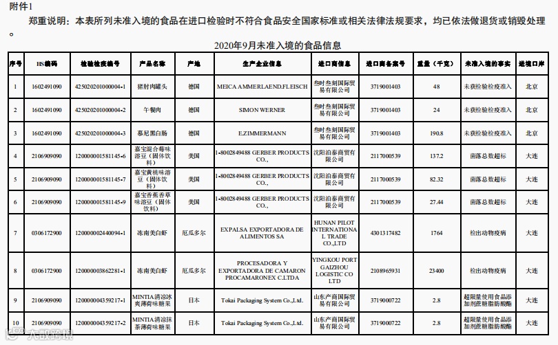 10月21日,海关总署发布2020年8月全国未准入境食品信息,未准入境的食品在进口检验时不符合食品安全国家标准或相关法律法规要求,均已依法做退货或销毁处理。