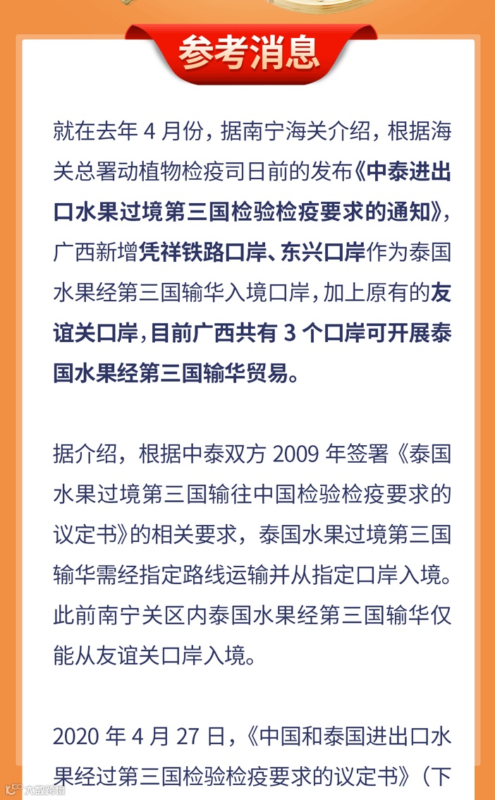 导读:广西新增凭祥铁路口岸、东兴口岸作为泰国水果经第三国输华入境口岸,加上原有的友谊关口岸,目前广西共有3个口岸可开展泰国水果经第三国输华贸易。
