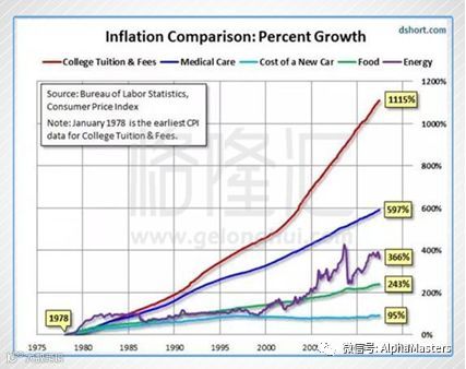 从美国数据看,教育成本的涨幅位居第一,超过医疗成本,价格极度刚性。