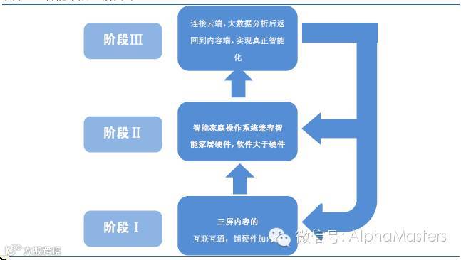 第三个层级:连接云端,大数据分析后返回到第一个层级的内容端,实现智能操作系统后,通过云端完成智能家庭生活的闭环。在家庭互联网端,以家庭为单位提供云服务,通过PC端、手机端和电视端提供内容服务,同时搜集家庭及个人用户的大数据,通过PC端、手机端和电视端提供内容服务(精准数字营销、游戏、网络购物等)变现,实现第三个层级与第一个层级的打通,从而构成了闭环。