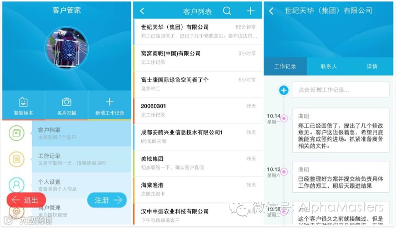 B、客户管家,为小微企业的销售人员提供客户关系管理工具,可以通过笔记、名片扫描、照片等方式实时管理其销售数据并进行分析,提高销售效率。“客户管家”则是典型 CRM 应用,和“工作圈”打通之后,社交内容可以直接沉淀至“客户管家”便于任务分配等后续操作。这两个应用基础免费+升级付费的模式。