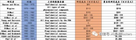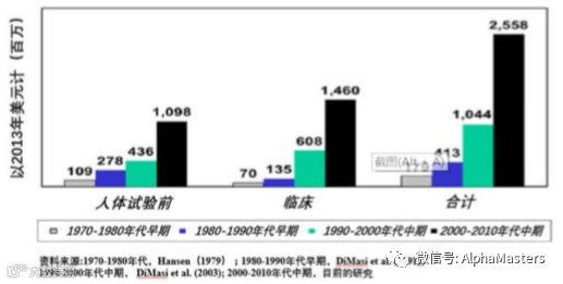 同时,Tufts Center有四篇分别在1979年、1991年、2003年、2013年四个不同时期进行的对于新药研发成本数据的统计。在四十多年间,人体试验前研发成本上升了10倍,临床研发成本上升了21倍,总成本上升了14倍。这些数据充分证明了新药研发日益复杂,预期总临床成功率仅11.83%。开发单个药物的资本化投入达到25.5亿美金(不包括FDA要求的审批后项目费用投入3.12亿美金),对应实付金额14亿美金,两表之间的费用差异与选择的样本有比较大的关系,但整体都是花费巨大。