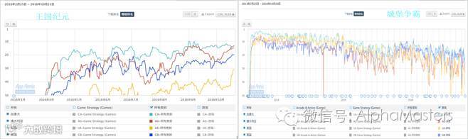 城堡争霸在美国、英国、加拿大和澳大利亚的GooglePlay排名最好,但王国纪元在这四个国家的GooglePlay排名已经表现更好,从下图还可以看出排名处于上升趋势。