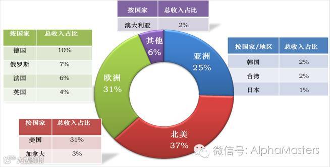 城堡争霸发行的国家几乎覆盖了全球手游市场,包括北美,欧洲,亚太和中东的主要国家和地区。收入主要来自欧美发达国家。2015年收入结构见下图。