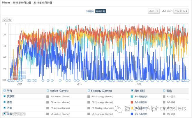 选取占比最高的美国、德国、俄国和法国来考查iOS渠道和GooglePlay畅销榜排名,在iOS渠道,四个国家排名比较靠前,也比较稳定,美国在15年后有轻微下滑,其他国家排名一直保持稳定。