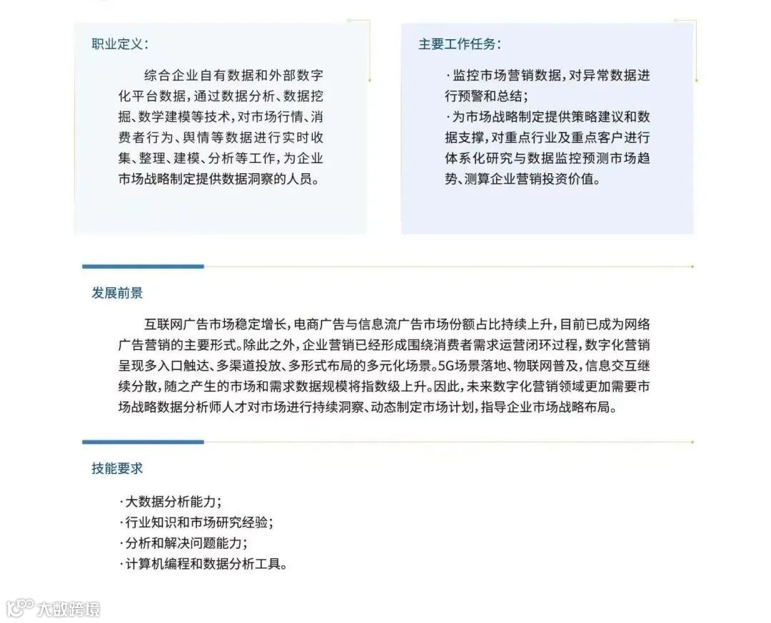 职业定义:综合企业自有数据和外部数字化平台数据,通过数据分析、数据挖掘、数学建模等技术,对市场行情、消费者行为、舆情等数据进行实时收集、整理、建模、分析等工作,为企业市场战略制定提供数据洞察的人员。