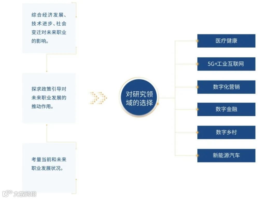 对这六大领域的选择,一方面是从产业维度出发,基于中国国家统计局战略新兴产业分类目录、美国关键技术选择目录,以及来自英国、德国和欧盟等国家和区域的科技规划;另一方面考虑到新职业产生的因素多,范围大,跨度广,重点围绕推动全球新兴产业发展的新一代信息技术,特别是5G、人工智能、云计算、大数据等发展,聚焦六大让传统职业得以更新的行业。