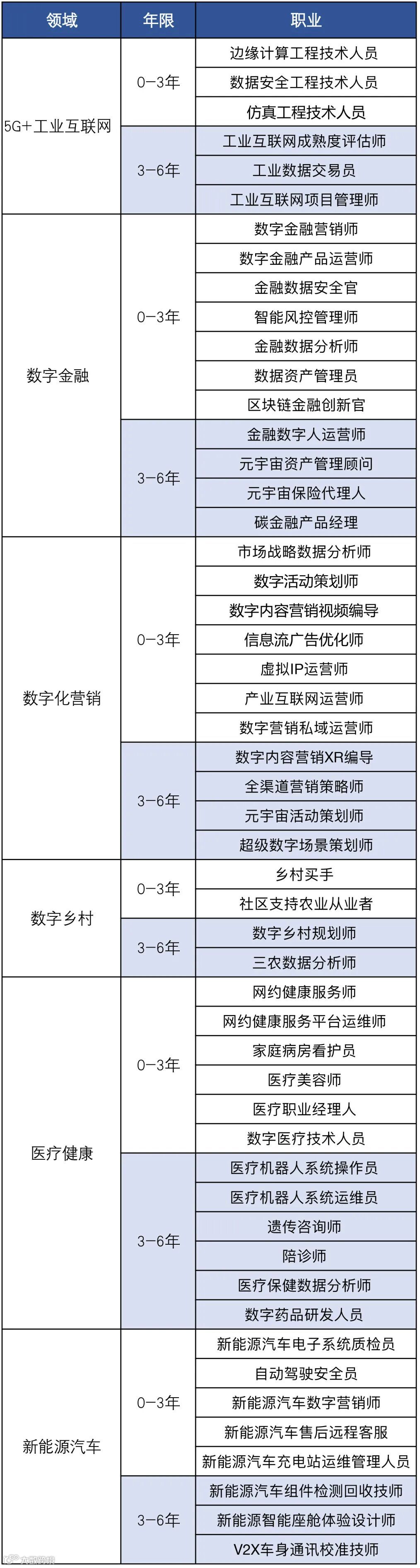 此次发布的52个未来职业“高清画像”,涉及涵盖医疗健康、5G+工业互联网、数字化营销、数字金融、数字乡村、新能源汽车等六大领域,依据发展成熟度分为0-3年与3-6年两个阶段,既可以看到新技术、新业态和新模式场景下,原有职业内涵发生变化的更新性职业,也可以看到全新职业类型,不仅明确了职业定义,细化了主要工作任务,更进一步列出了具体技能要求清单。