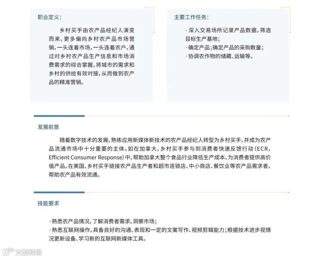 职业定义:乡村买手由农产品经纪人演变而来,更多偏向乡村农产品市场营销,一头连着市场,一头连着农户,通过对乡村农产品生产信息和市场消费需求的综合掌握,将城市的需求和乡村的供给有效对接,从而做到农产品的精准营销。