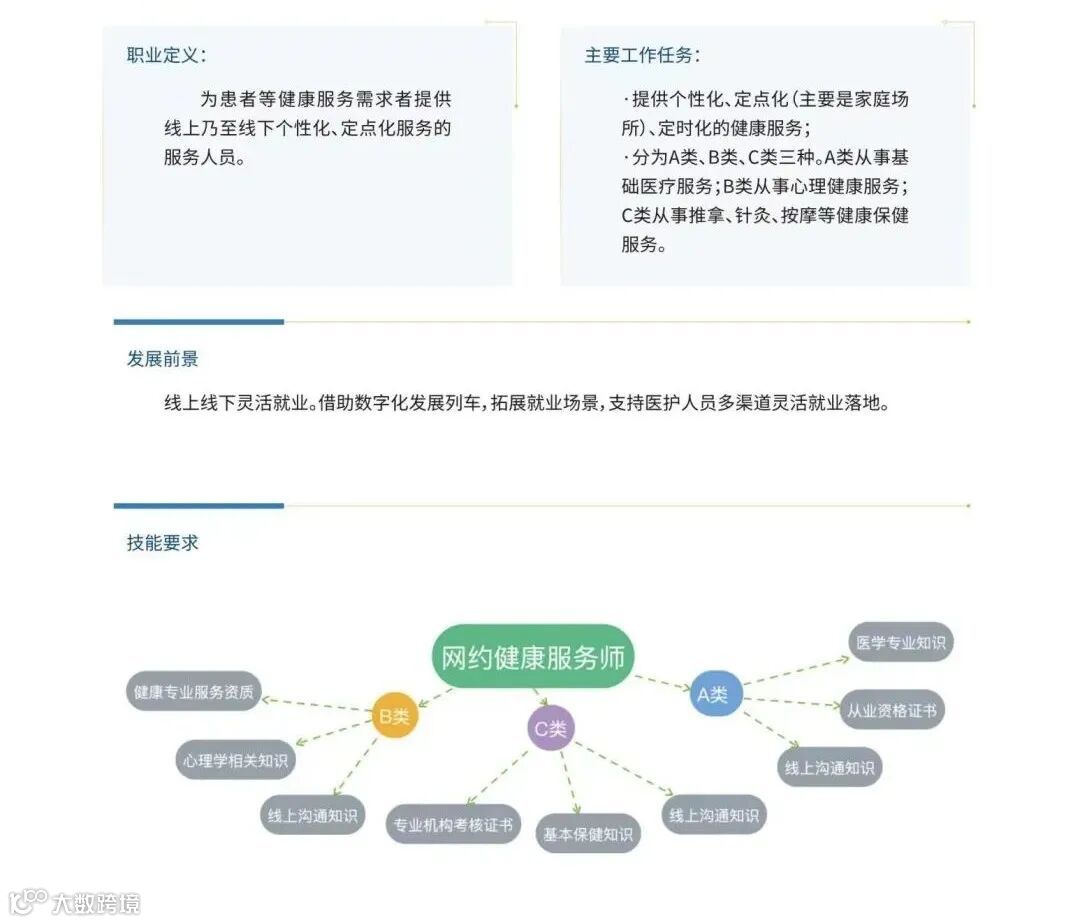 职业定义:为患者等健康服务需求者提供线上乃至线下个性化、定点化服务的服务人员。