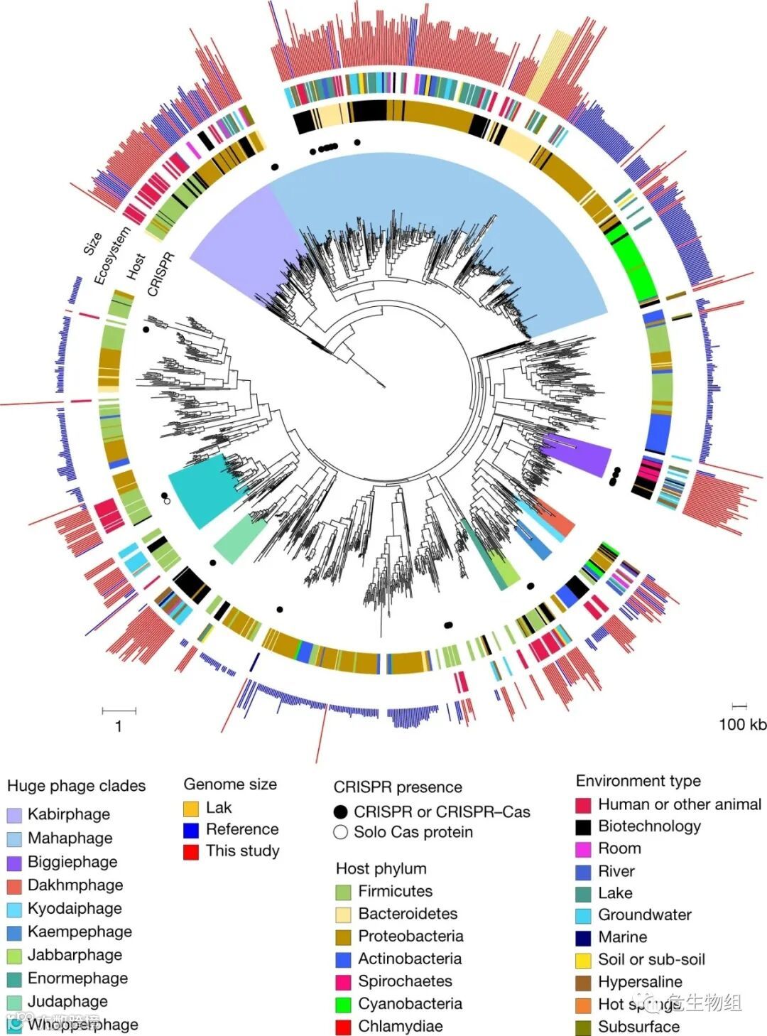 如利用16s rDNA序列对细菌进行分类一样,如果噬菌体基因组上存在一段片段。此片段十分保守,且兼具一定的种属特异性。利用这种标志性序列(biomarker sequence)对噬菌体进行基因水平的系统发育分类,是一种可取的方法。在疫情期间,我曾读到一篇发表于Nature的文献《Clades of huge phages from across Earth’s ecosystems》。这篇文献利用了大末端酶序列(large terminase)对大基因组(基因组大小超过200kb)噬菌体进行了系统发育分析。