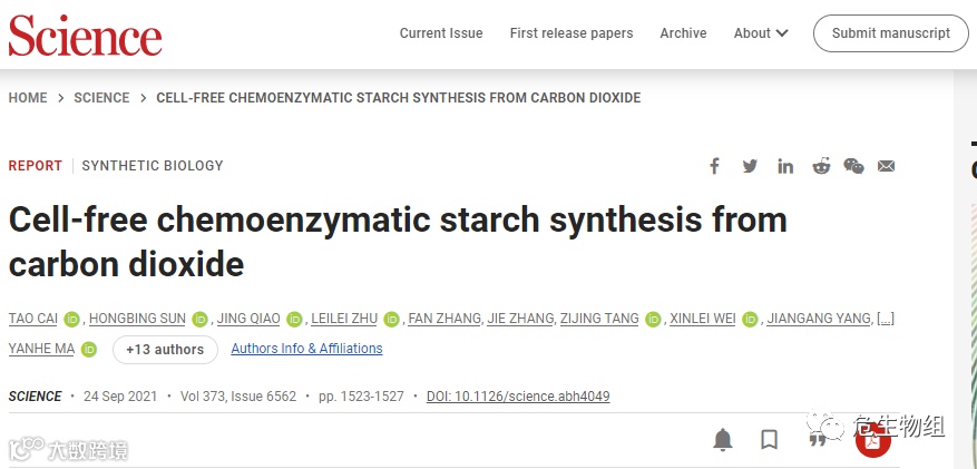论文的题目的为Cell-free chemoenzymatic starch synthesis from carbon dioxide翻译为题目为无需细胞的由二氧化碳合成淀粉的化学酶促反应。该论文发表与权威顶尖期刊<<Science>